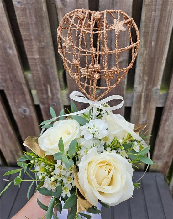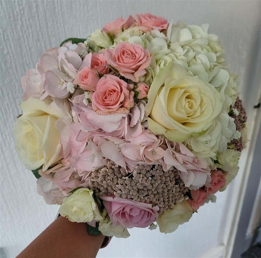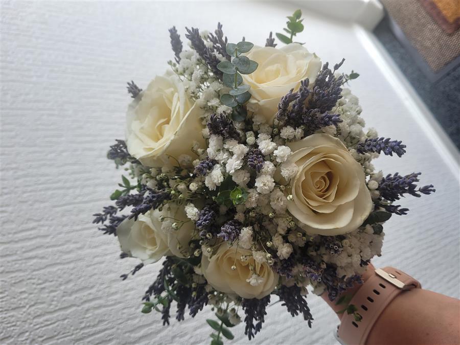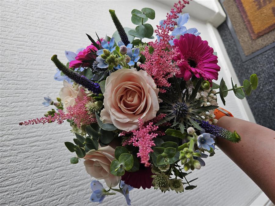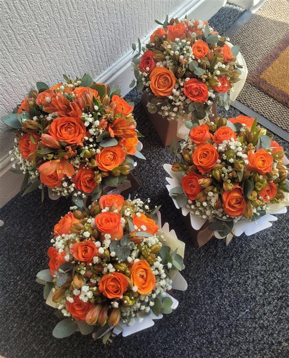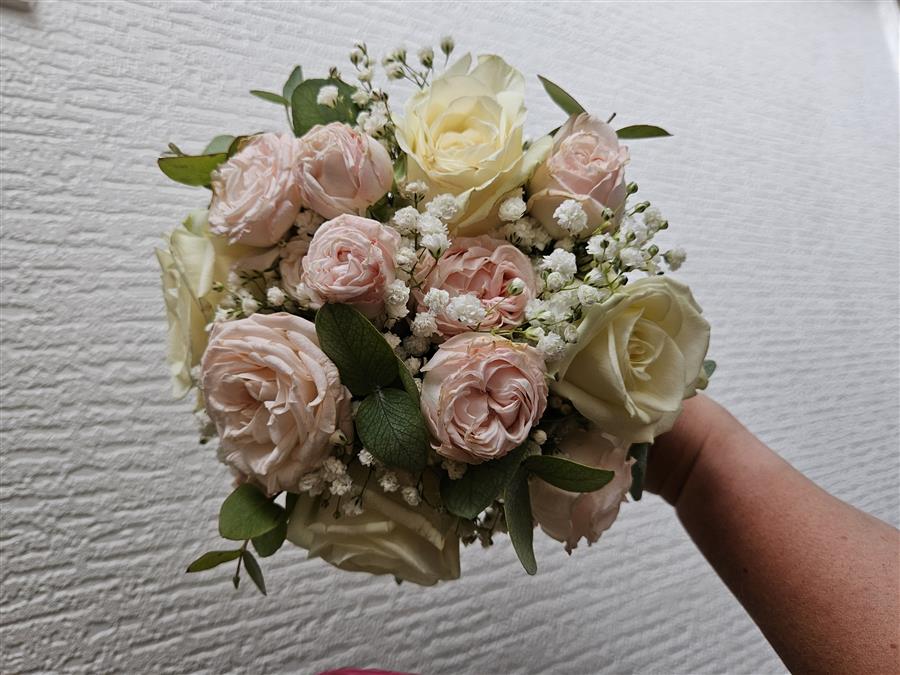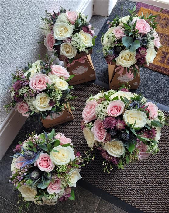 We work to your palette and bridal bouquet, adjusting tone and stem choice for cohesion. Satin or silk ribbon trails, twill bindings or simple wraps available.