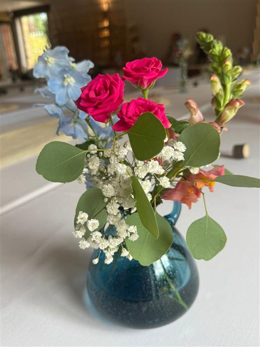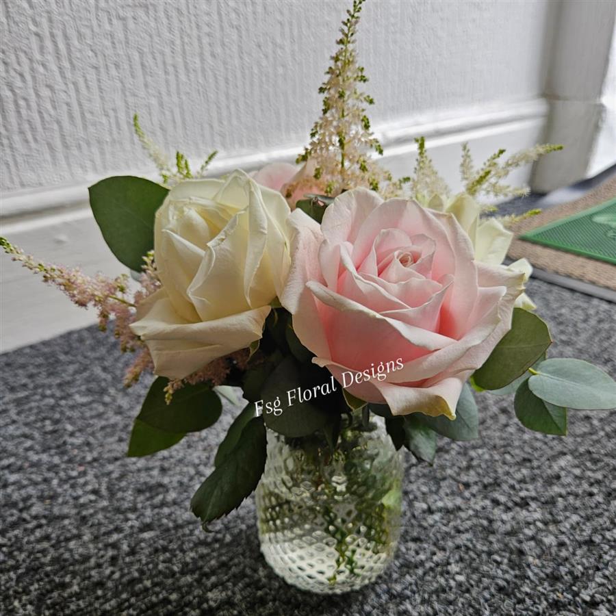 We use seasonal stems for freshness and value. Roses, lisianthus, stocks, hydrangea, dahlias in season, with eucalyptus and soft greens. Exact flowers may vary but the colour story and style remain true.