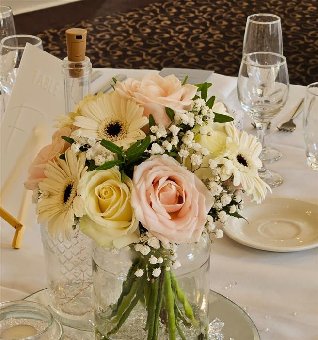 We design with movement in mind. Pedestals can flank a doorway after the ceremony. Aisle meadows can edge the top table or stage. Registrar flowers can become a focal piece by the cake or guest book.