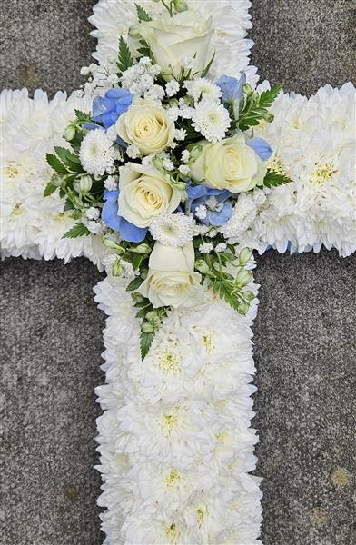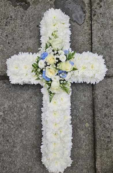 A floral cross tribute is a traditional arrangement of flowers shaped into a cross, often used as a funeral or memorial tribute. It's a powerful symbol of faith, hope, and eternal life, commonly chosen by those of Christian faith to honor the deceased.