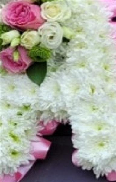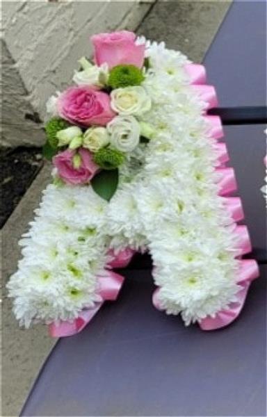 Funeral letters Based in white double Chrysanthemums with either a foliage or ribbon edge in a colour of your choice, finished with a flower crown on each end letter in complimentary colours.