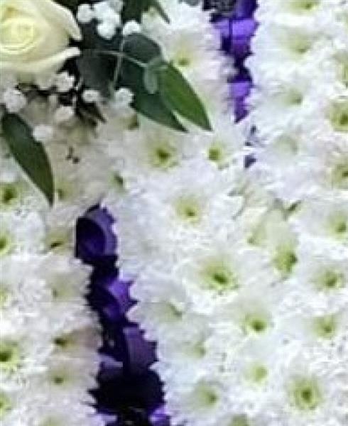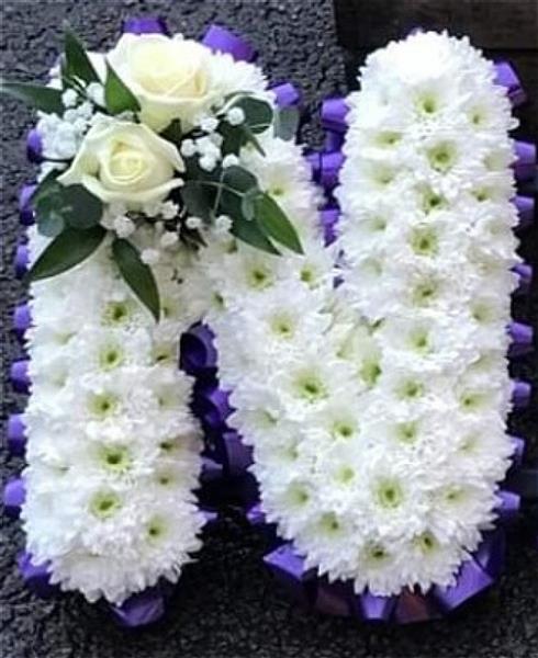 Funeral letters Based in white double Chrysanthemums with either a foliage or ribbon edge in a colour of your choice, finished with a flower crown on each end letter in complimentary colours.