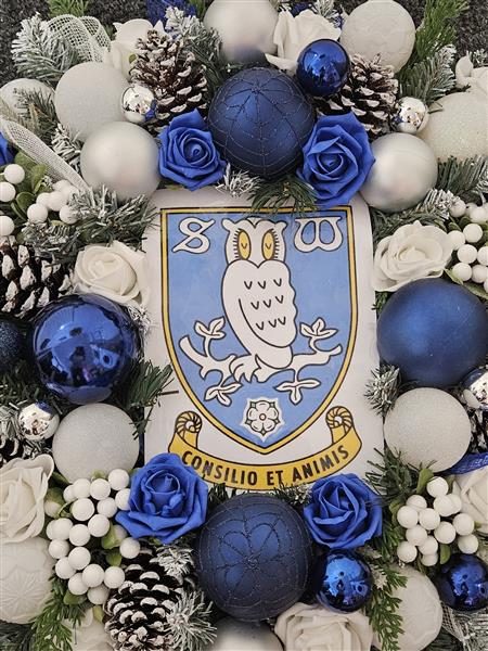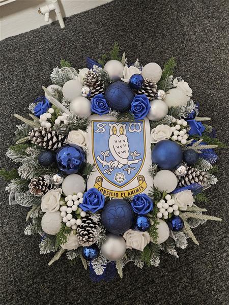 A stunning handmade wreath crafted on a high-quality artificial base, featuring layers of blue and white deco mesh inspired by Sheffield Wednesday colours. The design is enriched with mixed Christmas foliage, complemented by blue, white and silver baubles for a festive sparkle. Beautiful blue and white foam roses add elegance and depth, while the finishing touch—an official SWFC badge—makes this wreath the perfect seasonal decoration for any Owls supporter.