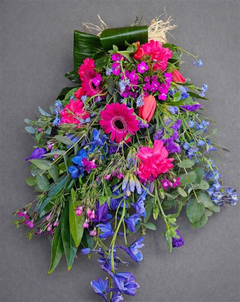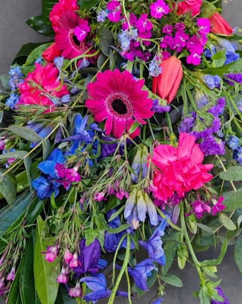 Mixed seasonal blue and purple flowers made into a simple tied sheaf arrangement