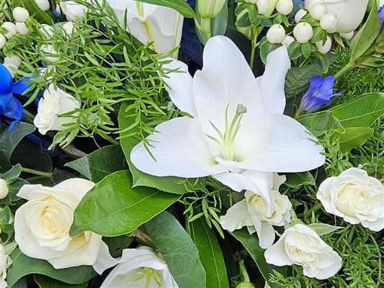 A casket spray featuring blue roses and white lilies creates a serene and elegant tribute. The combination of blue roses, symbolizing mystery and uniqueness, paired with white lilies, representing purity and renewal, can evoke a sense of calm and reverence.