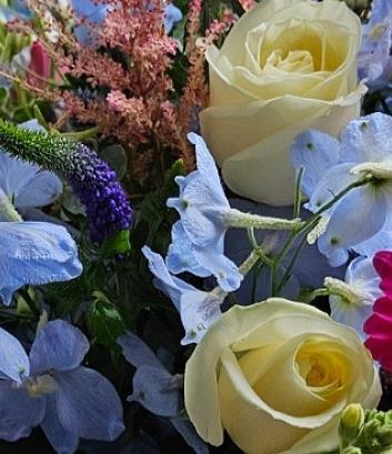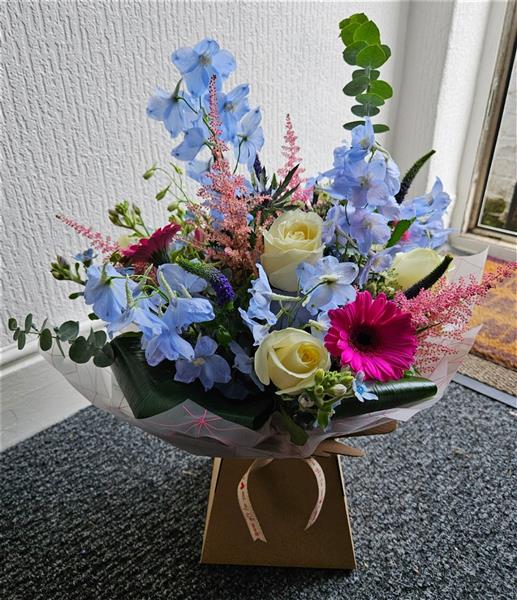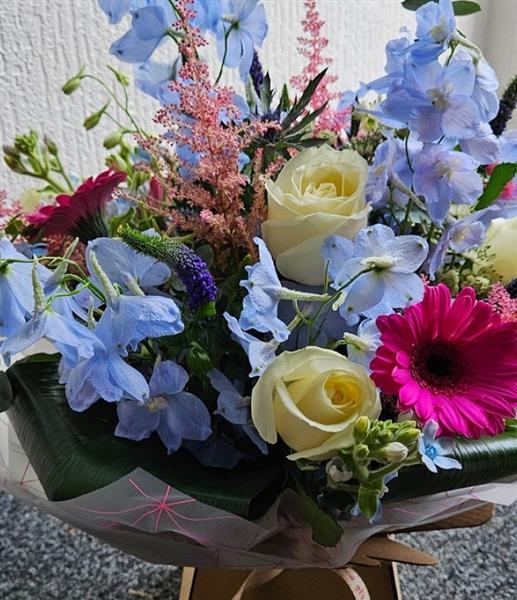 A graceful hand-tied in cool blues and soft creams, featuring sky-blue delphinium, ivory roses, vivid cerise germini, feathery pink astilbe and blue eryngium thistle, with eucalyptus, glossy aspidistra and fresh seasonal greenery. Airy, elegant and quietly uplifting.