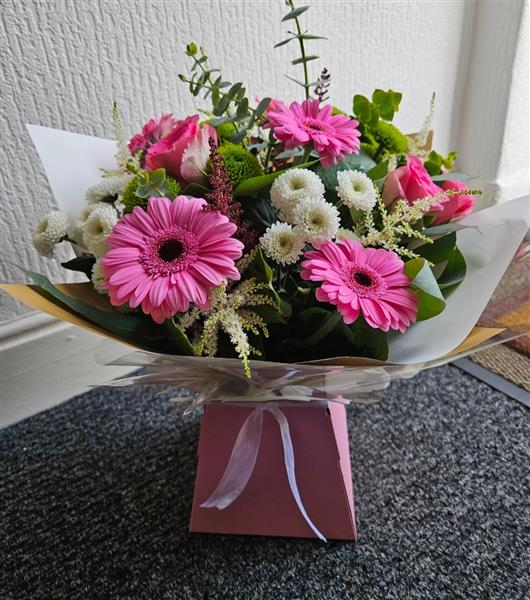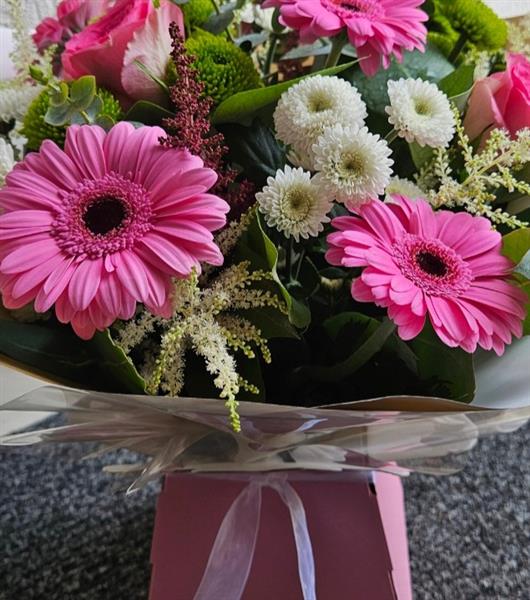 Delicate, fresh, and full of charm — this graceful hand-tied bouquet features pink mini gerberas, soft pink roses, and fluffy white astilbe, creating a romantic, airy feel. Crisp white button chrysanthemums and vibrant green chrysanthemums add brightness and texture, while eucalyptus and robusta foliage provide a fresh, natural finish.