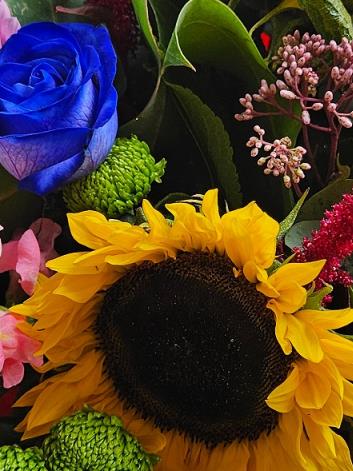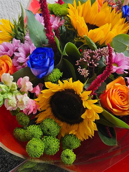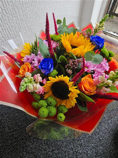 A joyful, mixed hand-tied bursting with golden sunflowers, vivid blue roses, tangerine roses, soft pink chrysanthemums, pale snapdragons, lime button chrysanths and rich burgundy amaranthus, with fresh eucalyptus for a gentle, leafy finish. Bright, colourful and kindly uplifting.
