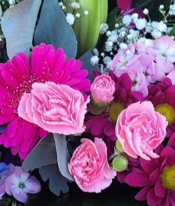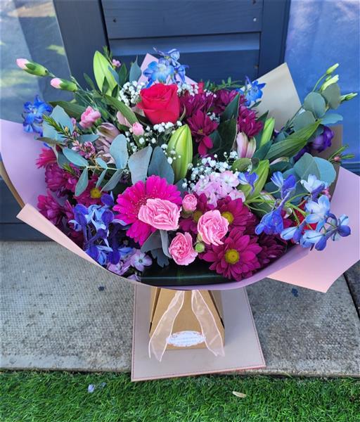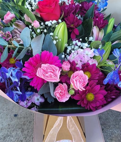 A vibrant hand-tied in rich berry and blue tones, featuring hot-pink germini, cerise chrysanthemums, pink carnations and spray roses, a classic red rose, sky-blue delphinium, soft alstroemeria and lily buds to open. Finished with cloud-soft gypsophila, cool eucalyptus and fresh leafy greenery. Colourful, textured and gently uplifting.