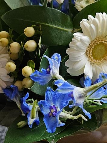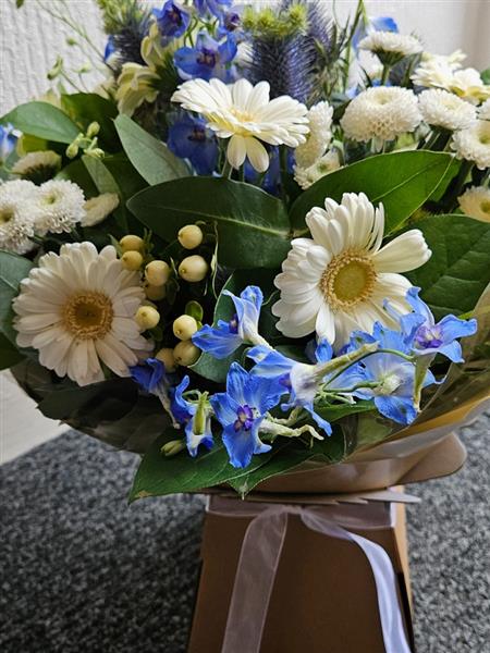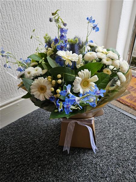 A gentle, airy hand-tied in soft creams and cool blues, featuring ivory germini, fluffy white spray chrysanthemums, sky-blue delphinium, blue eryngium thistle and pale hypericum berries, nestled with fresh salal/seasonal foliage. Calm, graceful and quietly uplifting.