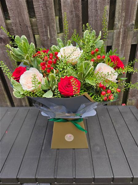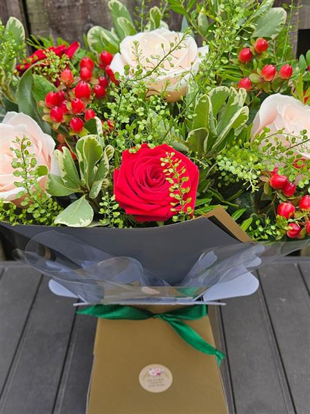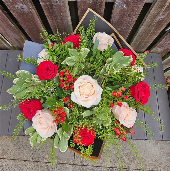 A beautifully balanced hand-tied of rich red roses and soft blush/ivory roses, threaded with red hypericum berries and lush seasonal greenery including variegated pittosporum and ruscus. Elegant, fresh and gently romantic, a lovely way to send warm wishes with classic roses and a hint of berry charm.