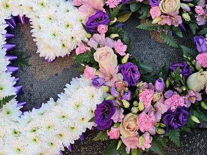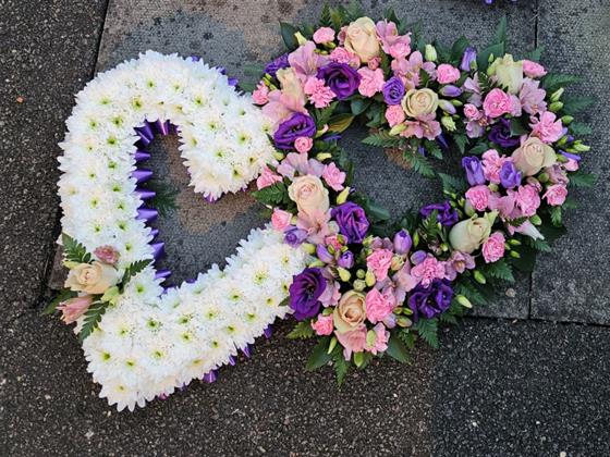 Double entwined heart white based Chrysanthemums on one side and mixed seasonal flowers on the other, available in various colours.