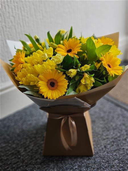 A bright, sunny hand-tied in cheerful yellow tones, featuring golden germini, yellow spray chrysanthemums, soft yellow carnations and lemon alstroemeria, gathered with fresh leafy greenery (salal/seasonal foliage). Warm, friendly and gently uplifting.