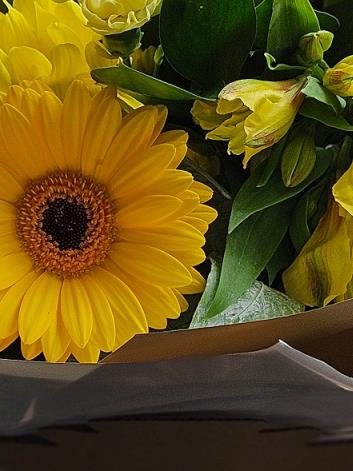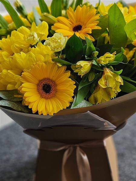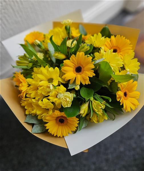 A bright, sunny hand-tied in cheerful yellow tones, featuring golden germini, yellow spray chrysanthemums, soft yellow carnations and lemon alstroemeria, gathered with fresh leafy greenery (salal/seasonal foliage). Warm, friendly and gently uplifting.