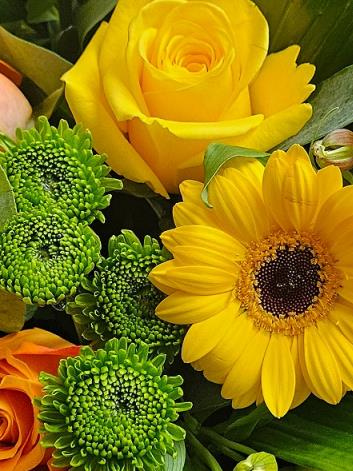 Here’s a warm, uplifting hand-tied featuring sunny yellow and orange germini, yellow and tangerine roses, cheerful alstroemeria, lime-green button chrysanthemums, and glossy folded aspidistra with fresh foliage. Soft colours, bright smiles, and a gentle burst of sunshine for any day.