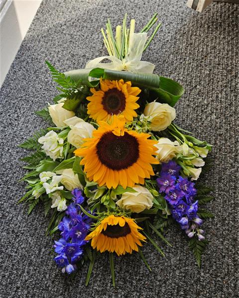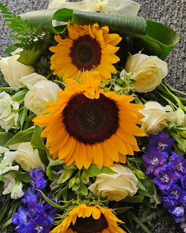 Delicate avalanche roses and vivid sunflowers unite in this elegant sympathy sheaf, embracing warmth and tranquility in a single gesture. The deep blues of the delphinium offer a soothing contrast, reminiscent of peaceful skies and quiet moments. Lush greenery, including pistacha and leather leaf, adds depth and texture to this heartfelt arrangement.