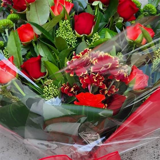 Each stem is carefully selected to create a harmonious balance of color and form, delivering not just beauty but a heartfelt message of comfort. The lush greens and deep reds evoke the warmth of shared memories and the quiet strength of enduring love. The tied sheaf design ensures a sleek and elegant presentation, making it ideal for expressing condolences.