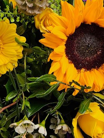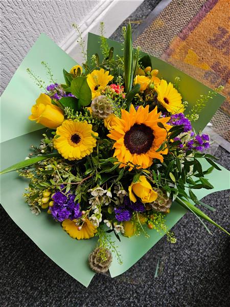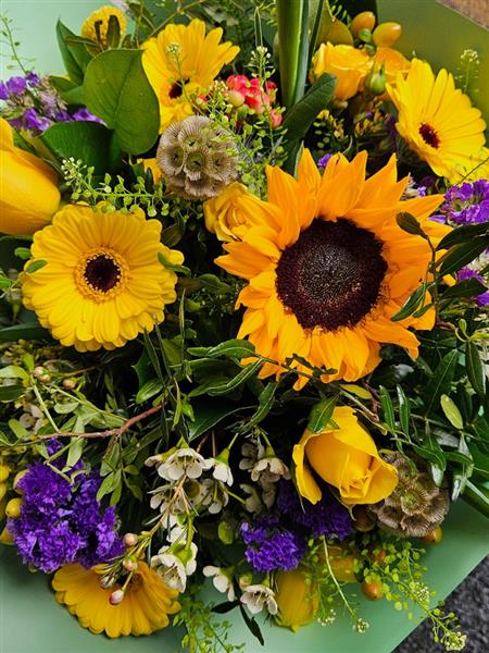 A cheerful, garden-style hand-tied featuring a sunny sunflower, yellow germini, golden yellow roses, purple statice, airy solidago, dainty waxflower, rustic scabiosa seed heads and sprigs of yellow hypericum, gathered with lush seasonal greenery.