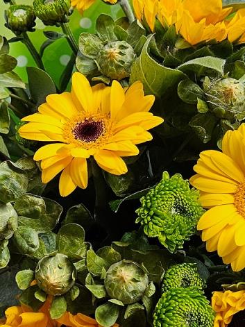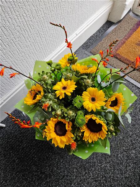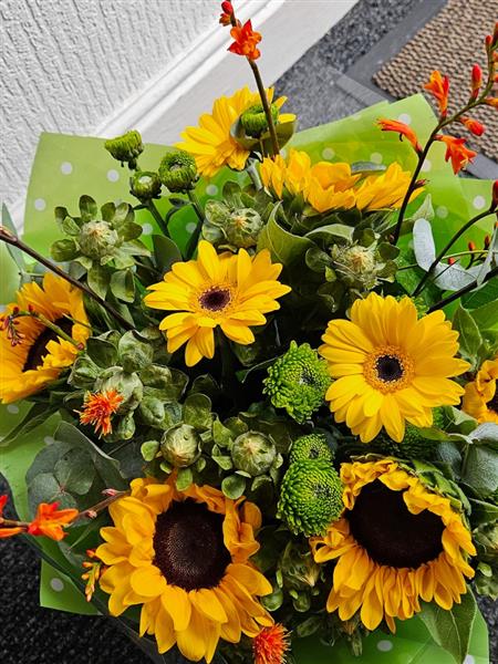 A cheerful hand-tied brimming with golden sunflowers and sunny yellow germini, lifted by fiery crocosmia, lime button chrysanthemums and fresh green hypericum berries, all nestled with soft eucalyptus. Warm, bright and gently uplifting. A lovely way to send a little sunshine.