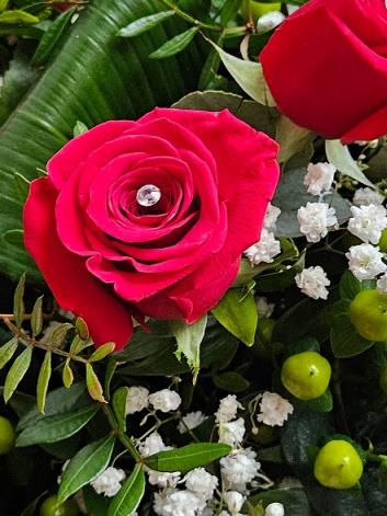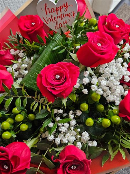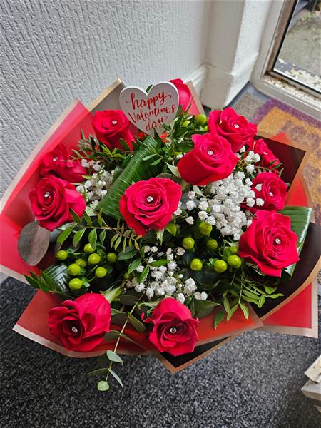 A romantic hand-tied of velvety red roses (with diamanté pins), cloud-soft gypsophila, fresh green hypericum berries and eucalyptus, finished with glossy folded aspidistra and ruscus. Timeless, elegant and softly spoken.