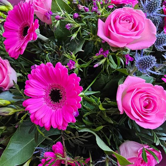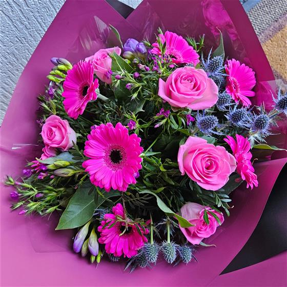 A vibrant hand-tied in rich pink tones, featuring hot-pink germini, soft pink roses, lilac freesia buds and blue eryngium thistle, with dainty pink waxflower and lush leafy greenery (salal/ruscus). Cheerful, stylish and gently uplifting.