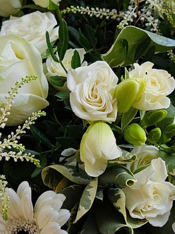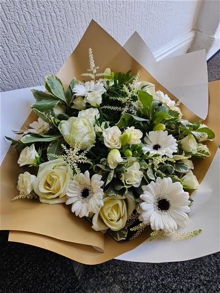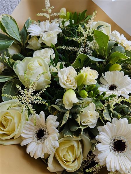 A calm, elegant hand-tied in soft whites and creams, featuring ivory roses, white germini, lisianthus and delicate freesia, with feathery white astilbe and seasonal greenery including variegated pittosporum and ruscus.
