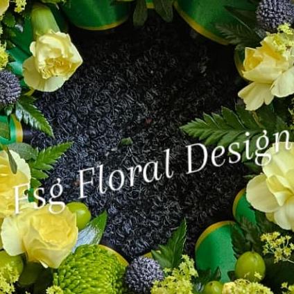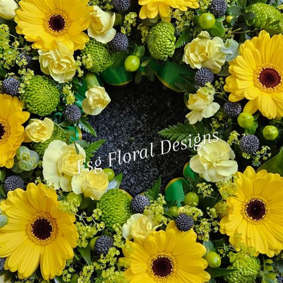 Mixed flowers in yellow and green finished with the jamican colours of green, gold and black ribbon edging.