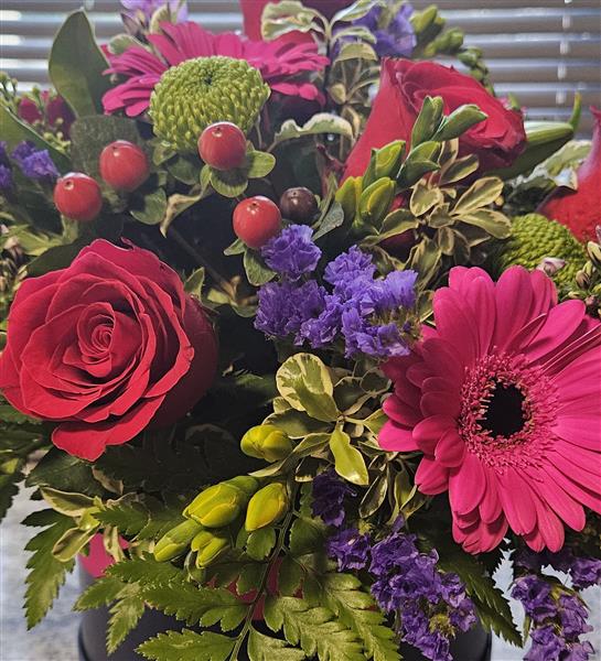 A vibrant hat box bursting with colour and charm, featuring cerise mini gerbera, classic red roses, delicate purple phlox, cheerful yellow freesia, green chrysanthemums, and rich Hypericum berries. Beautifully complemented with a selection of mixed seasonal foliages, this striking design is perfectly arranged in a stylish hat box — making it a stunning gift for any occasion.