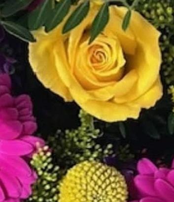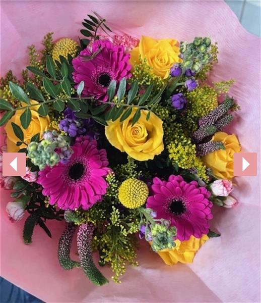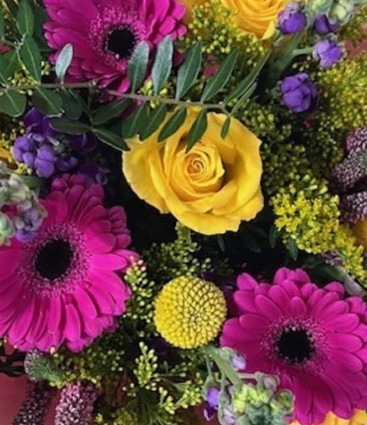 A bright, joyful hand-tied featuring hot-pink germini, sunny yellow roses, cheerful craspedia (billy buttons), purple lisianthus, soft veronica spikes and golden solidago, with touches of pale spray carnations and fresh leafy foliage. Colourful, uplifting and kindly spoken.