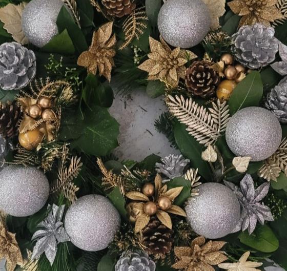 A stunning, opulent Christmas wreath crafted from a rich blend of seasonal foliages. This luxurious design features an elegant harmony of gold and silver accents, including sparkling silver and gold baubles, shimmering glitter flowers, and beautifully frosted silver and gold pinecones. Clusters of gold berries and delicate gold foliage leaves add depth, warmth, and festive richness. The combination of metallic tones creates a sophisticated, radiant wreath perfect for adding a touch of glamour to any holiday décor.