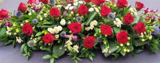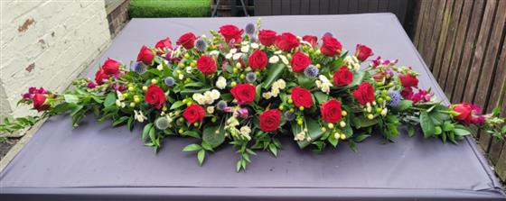 Luxury Rose Casket Spray, a fitting tribute for a special loved one, available in various sizes and colours.