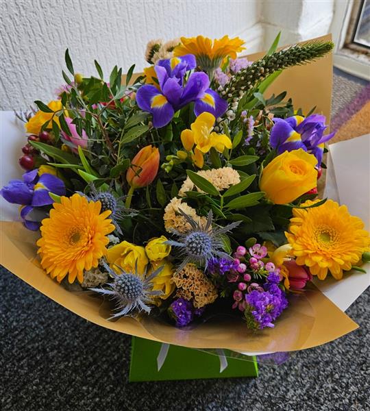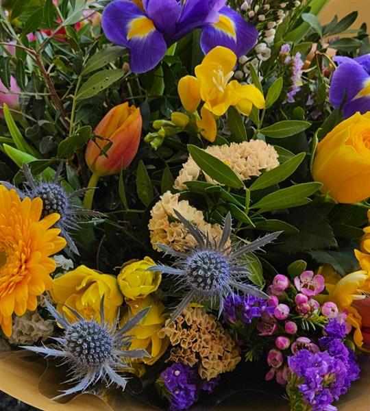 A beautiful spring time mix of mini yellow gerbera, iris, tulups, daffolidils, thistle and mixed seasonal foliagea
