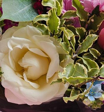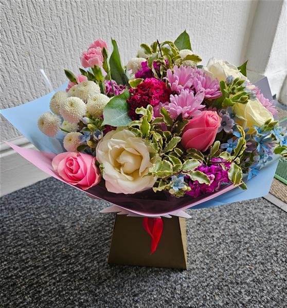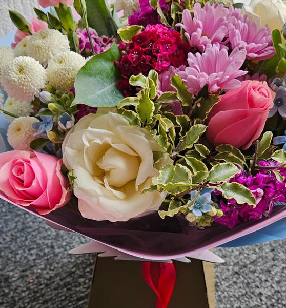 A pretty, pastel hand-tied featuring ivory and soft pink roses, blush lisianthus, pink chrysanthemum daisies, white button chrysanths and rich cerise dianthus, with dainty sky-blue blooms (forget-me-not/oxypetalum) and variegated pittosporum foliage. Gentle, fresh and uplifting — a sweet everyday gesture.