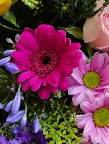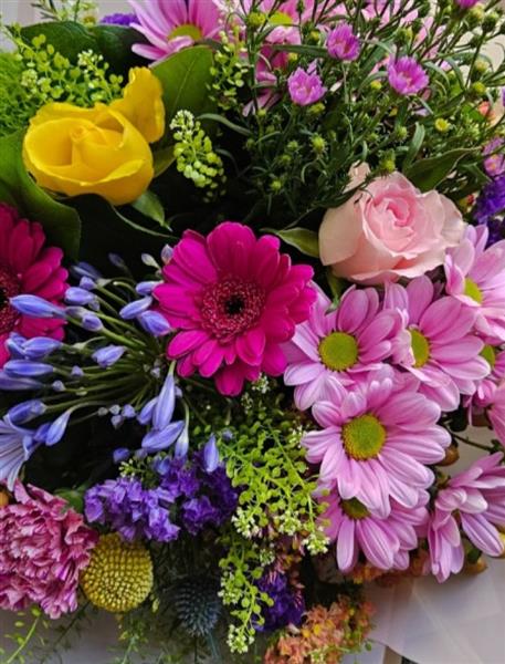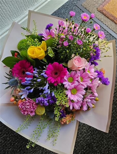 A cheerful, garden-style hand-tied brimming with hot pink germini, pink chrysanthemum daisies, a sunny yellow rose, a soft pink rose, purple statice, blue agapanthus buds, blue eryngium, lime button chrysanths, pink carnation, a touch of craspedia and seasonal greenery (salal/ruscus). Fresh, colourful and gently uplifting.