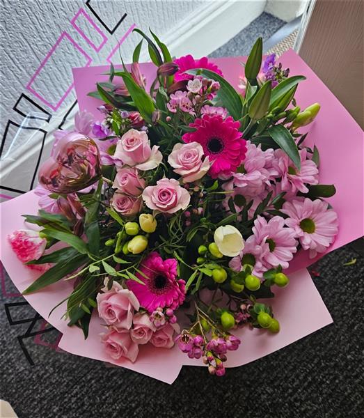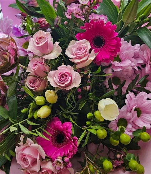 A cheerful, feminine hand-tied in pretty pinks, featuring hot-pink germini, soft pink roses and spray roses, pink chrysanthemum daisies, dainty pink waxflower, elegant lily buds, white lisianthus, fresh green hypericum berries and lush foliage. Gentle, uplifting and full of sweet detail.