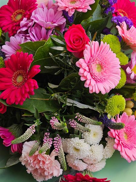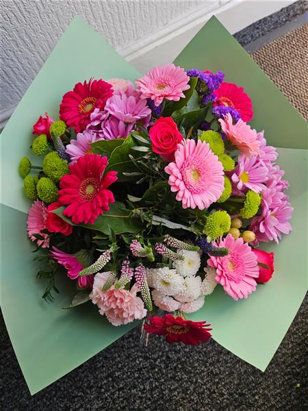 A cheerful, mixed hand-tied in joyful pinks and greens, featuring hot-pink and soft-pink germini, pink chrysanthemum daisies, lime button chrysanths, pretty veronica, pale pink carnations, a touch of purple statice and yellow hypericum berries, with fresh leafy foliage. Bright, friendly and gently uplifting.