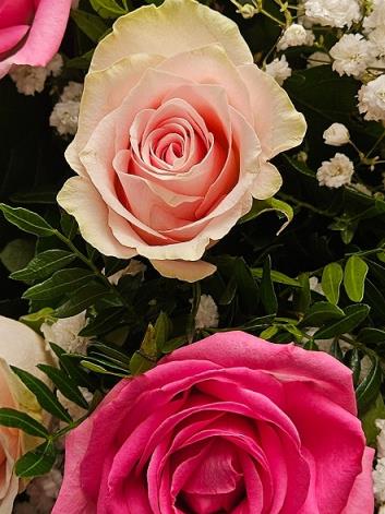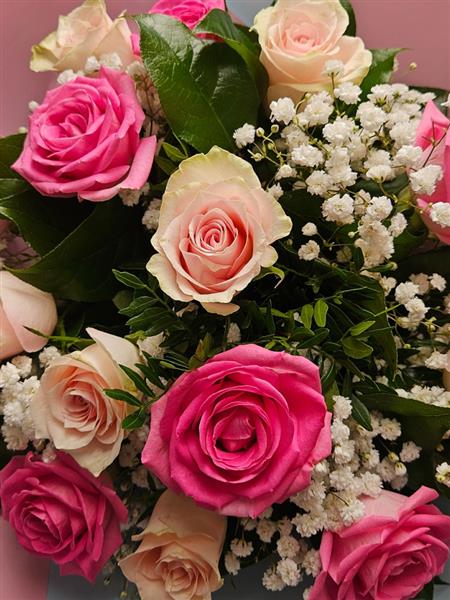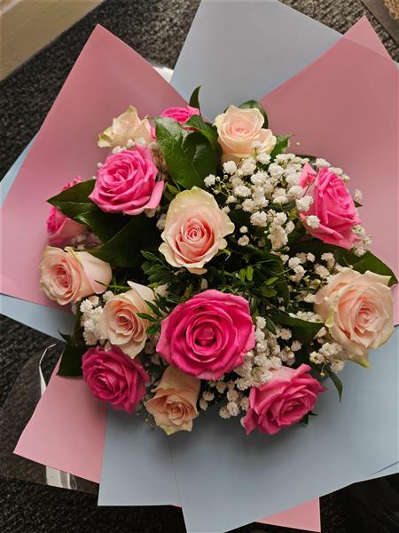 A pretty hand-tied of mixed pink roses and soft blush roses, cushioned with cloud-soft gypsophila and a touch of fresh leafy greenery. Gentle colour, classic shape and a sweet, romantic feel — lovely for birthdays, thank yous or just because.