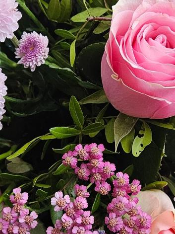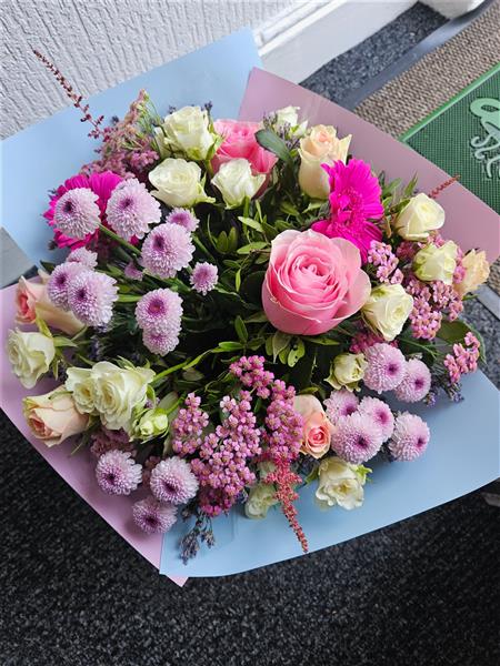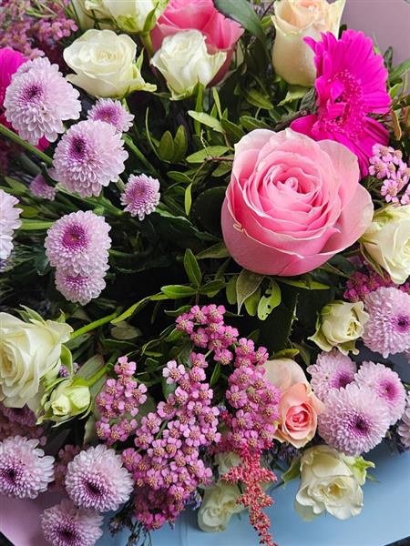 A pretty, pastel hand-tied in soft pinks and creams, featuring pink roses and spray roses, ivory roses, hot-pink germini, fluffy pink button chrysanthemums, dainty pink heather/waxflower and airy pink astilbe, with touches of lilac limonium and fresh leafy greenery. Gentle, feminine and quietly uplifting.