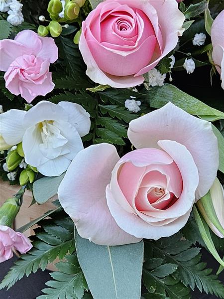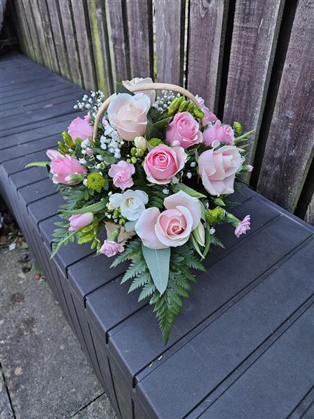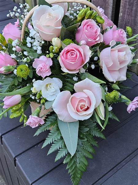 A beautiful basket arrangement of mixed pink roses, white freesia, spray pink carnations, pink tulips, finished with gypsophila and mixed foliages in a country style basket.
