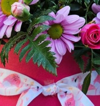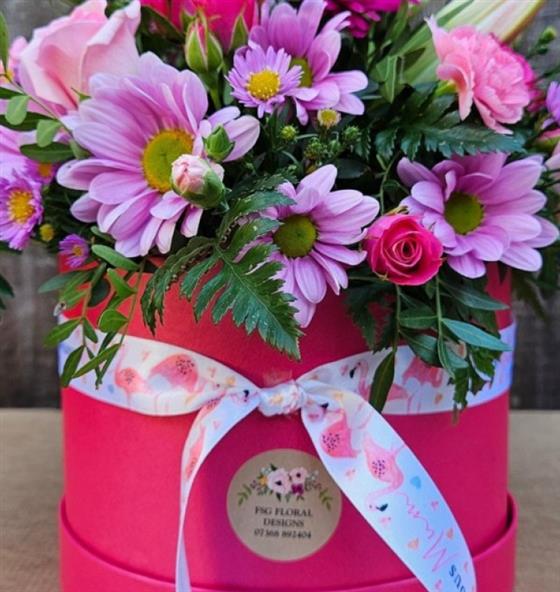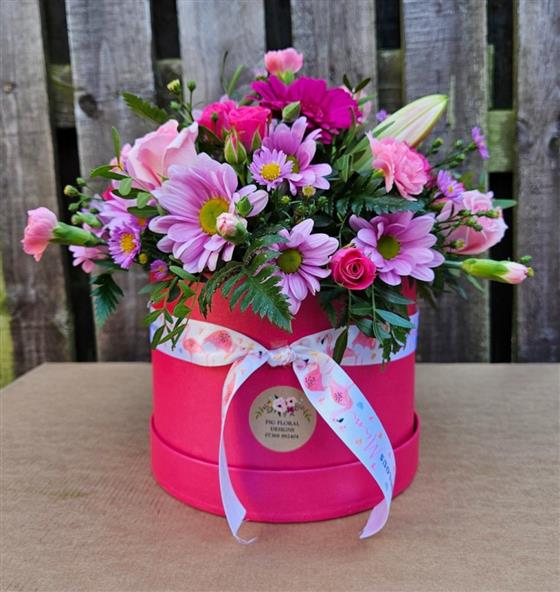 A cheerful hatbox arrangement in pretty pinks and lilacs, featuring pink chrysanthemum daisies, hot-pink germini, soft pink spray roses, lisianthus, dainty asters, blush carnations and a lily bud, arranged with fern and fresh leafy greenery. Sweet, uplifting and ready to enjoy.