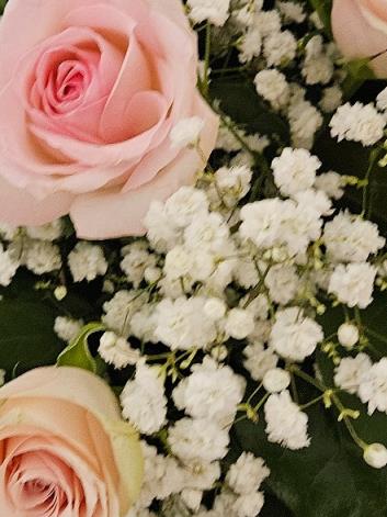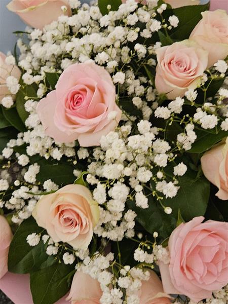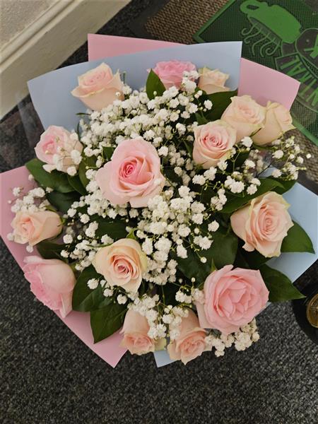 A classic, romantic hand-tied of soft pink roses, cushioned with cloud-like gypsophila and a touch of fresh leafy greenery (salal/seasonal foliage). Gentle colour, sweet and elegant for any thoughtful occasion.