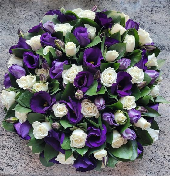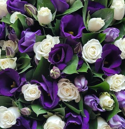 This arrangement consists of roses, purple lisianthus and foliage, finished with a complimentary ribbon edging.