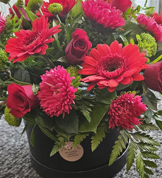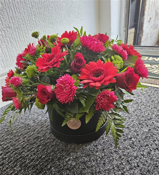 Ruby Red Hatbox featuring red roses, red mini gerbera and red asters finished with mixed foliages in a black hatbox.