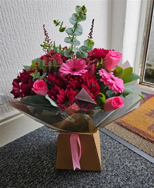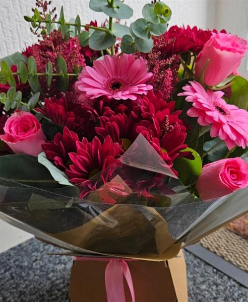 Soft romance meets passionate flair in this stunning hand-tied bouquet. Featuring elegant pink roses and playful pink mini gerberas, it's beautifully contrasted by the rich depth of red chrysanthemums and feathery red astilbe. Accented with fresh eucalyptus and robusta foliage, this arrangement blends softness and strength in perfect harmony.