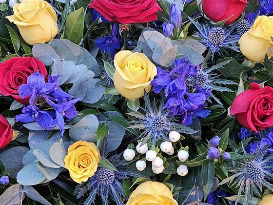 Red roses, yellow roses, blue delphinium, white Hypericum berries and thistle, finished with eculptus and mixed seasonal foliage.