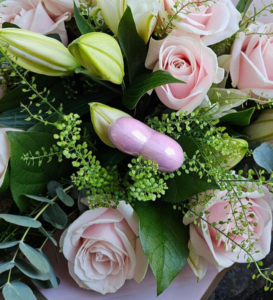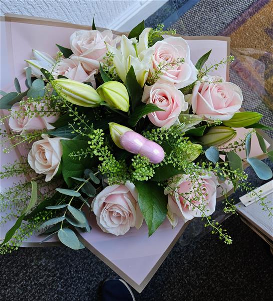 A gentle, romantic hand-tied featuring blush-pink roses and elegant white oriental lilies (many in bud to open), with airy lime alchemilla and cool eucalyptus nestled in lush greenery. Softly scented, graceful and quietly uplifting.