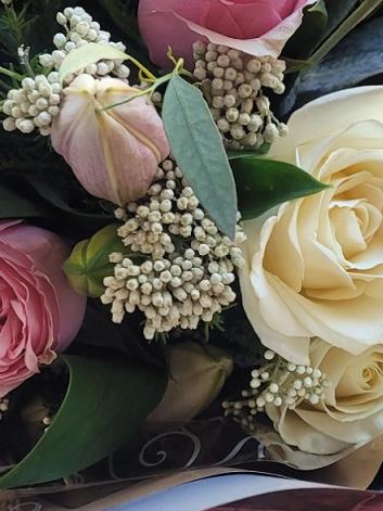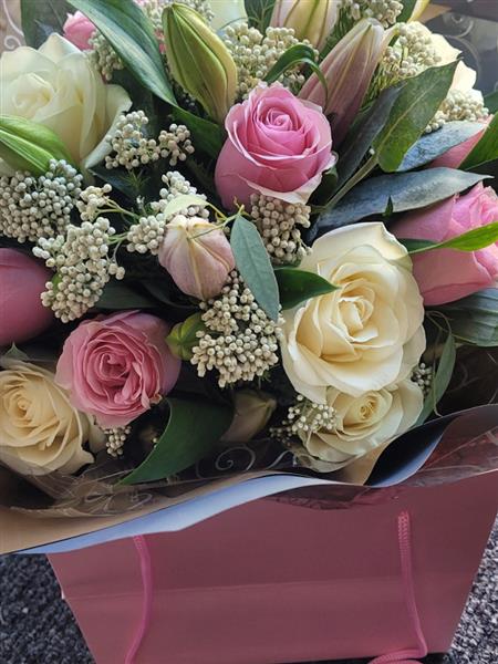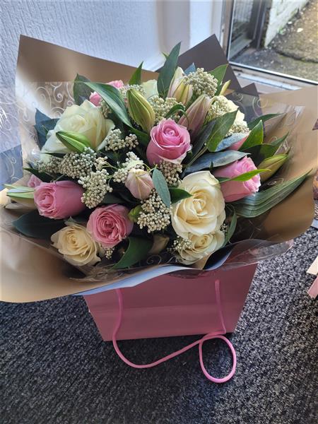 A gentle, romantic hand-tied in blush and ivory, featuring pink and cream roses with elegant pink oriental lily buds to open. Dainty clusters of white riceflower add softness, nestled among lush ruscus and lily foliage. Graceful, scented and quietly uplifting.
