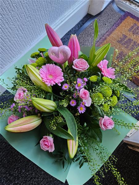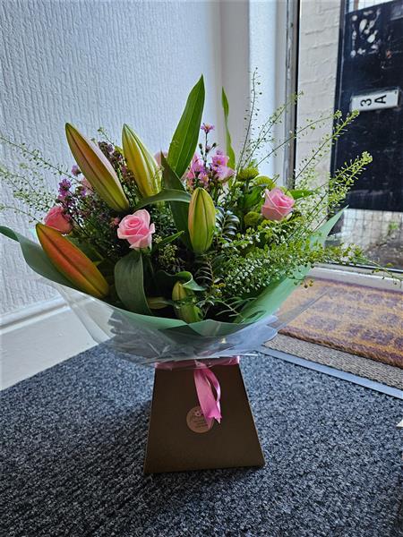 Stargazer Lilies and pink roses combined make a lavish bouquet in handcradted wrap.