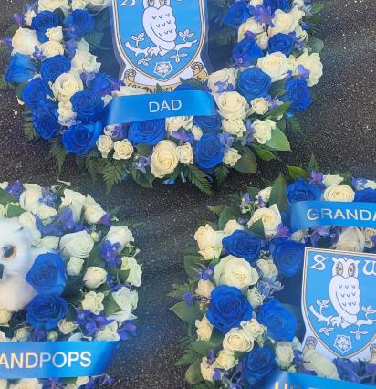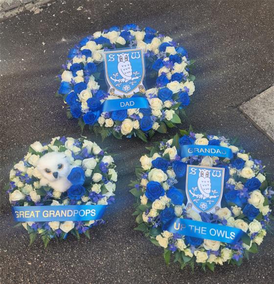 Swfc wreaths made with blue dyed roses, white roses, blue delphinium, white spray roses and foliages.