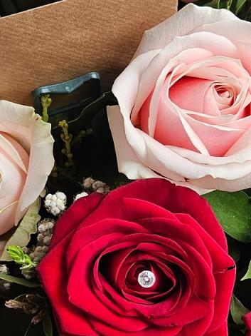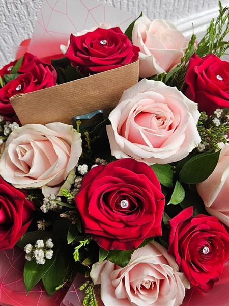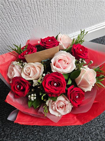 A romantic hand-tied of classic red and blush pink roses (a few finished with diamanté sparkle), with cloud-soft gypsophila and fresh seasonal greenery. Elegant, full and gently spoken, perfect for heartfelt messages.
